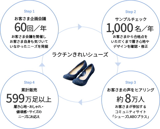 お客さまと一緒に考え、一緒につくることをくり返し、お客さまから80点以上の合格点をクリアしたもののみを「ラクチンきれいシューズ」として販売しています。